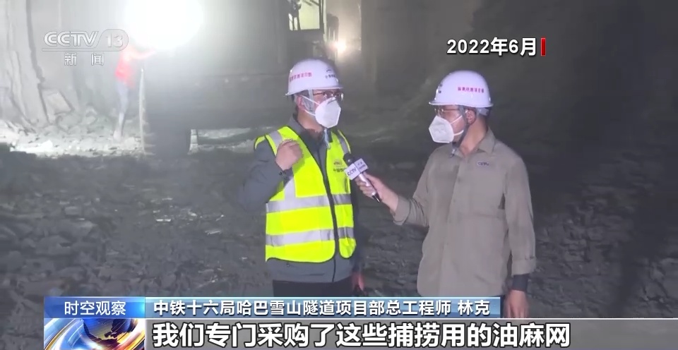 中铁十六局哈巴雪山隧道项目部总工程师 林克:我们专门采购了这些捕捞用的油麻网,然后挂在拱顶,防止掉石块伤人,这个网的承重,每张网大概能承受500到800公斤的重量。