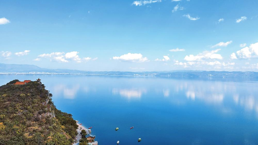 抚仙湖,位于云南玉溪澄江市,抚仙湖水水清如镜,湛蓝沁心,早在明末,旅行家徐霞客赞美道:“滇山惟多土,故多壅流而成海,而流多浑浊,惟抚仙湖最清”,因水面宽阔,又被称为“琉璃万顷”。