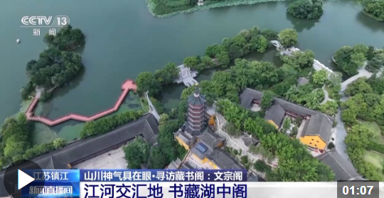 镇江市图书馆原副馆长、研究员 徐苏:那么为什么讲文宗阁的“宗”字没带“水”旁带有水意呢?后代有很多说法。我们认为一个它是对祖宗存书的尊崇,同时有一点就是说对金山独特地貌的肯定。因为金山当时来讲,它处在江河交汇的独特的环境下,所以乾隆在诗里面强调了对祖宗传书的尊崇之意以外,特别强调“百川于此朝宗海,是地诚应庋此文”。这时候实际上讲,他也强调了地貌,也有它独特的意思,就是说这个地方虽然没加“水”旁,但是已经有水的含义在里面了,而且这个想法也是得到大多数学者肯定的。