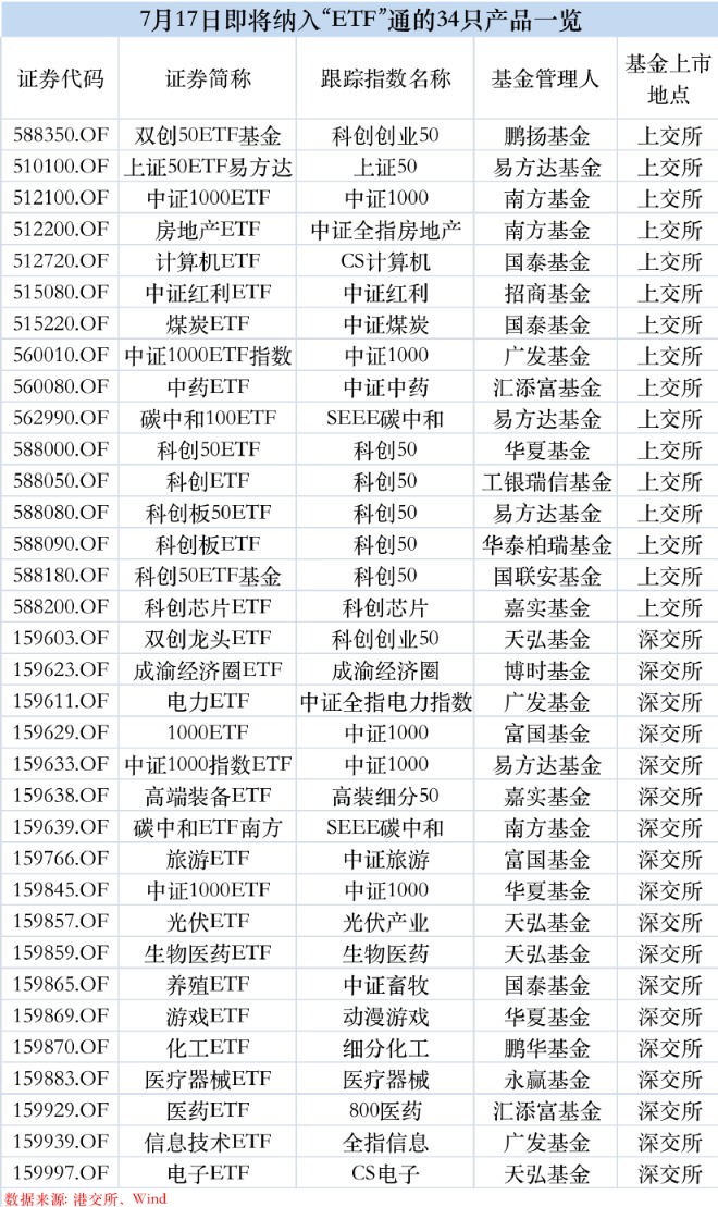港交所数据显示,这34只“ETF通”的新成员包括科创50ETF等特色ETF。其中,上交所上市的有16只,分别为双创50ETF基金、上证50ETF易方达、中证1000ETF、房地产ETF、计算机ETF等;以及深交所上市的双创龙头ETF、成渝经济圈ETF、电力ETF、1000ETF等18只。