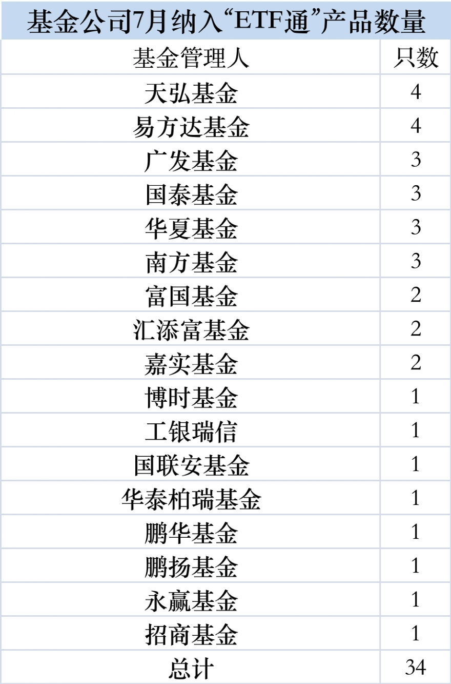 从涉及基金公司来看,本次新纳入互联互通的34只ETF中,易方达、天弘基金管理有限公司最多,上述两家基金公司各有4只ETF纳入。此外,广发、国泰、华夏、南方各占据3席,富国、汇添富、嘉实各占据2席。