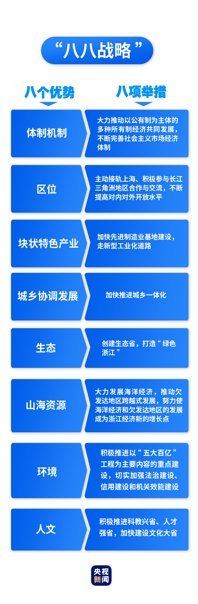 2003年7月10日,浙江省委十一届四次全体(扩大)会议召开。时任浙江省委书记习近平全面系统阐释了浙江发展的“八个优势”,提出了指向未来的“八项举措”,这就是“八八战略”。