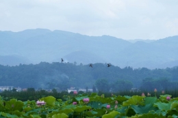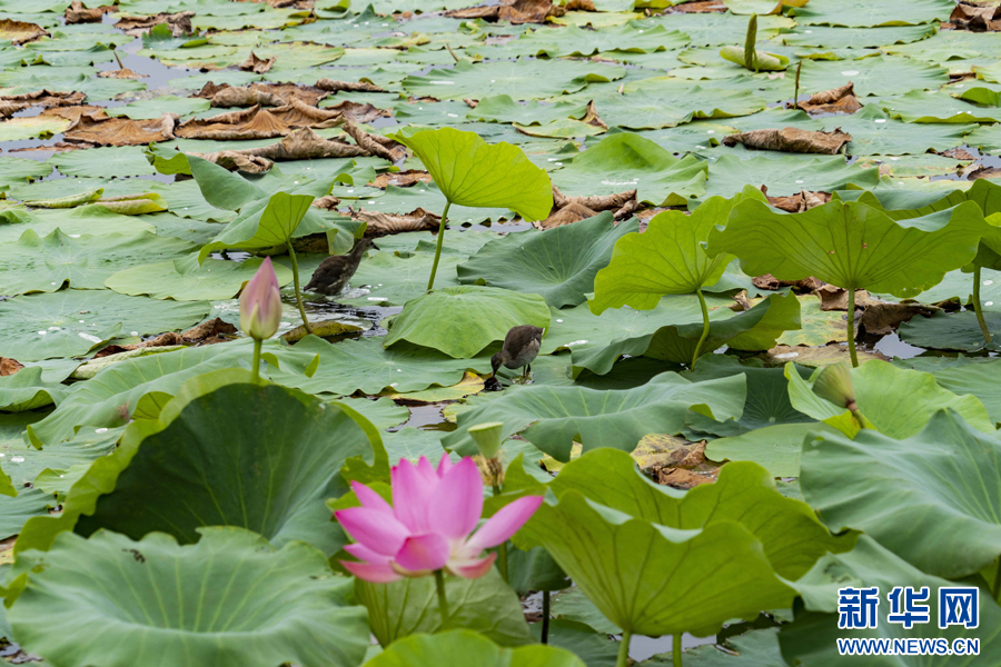 弥勒市湖泉生态园内绽放的荷花与在此栖息的鸟类(6月11日摄)。(郑益 摄)