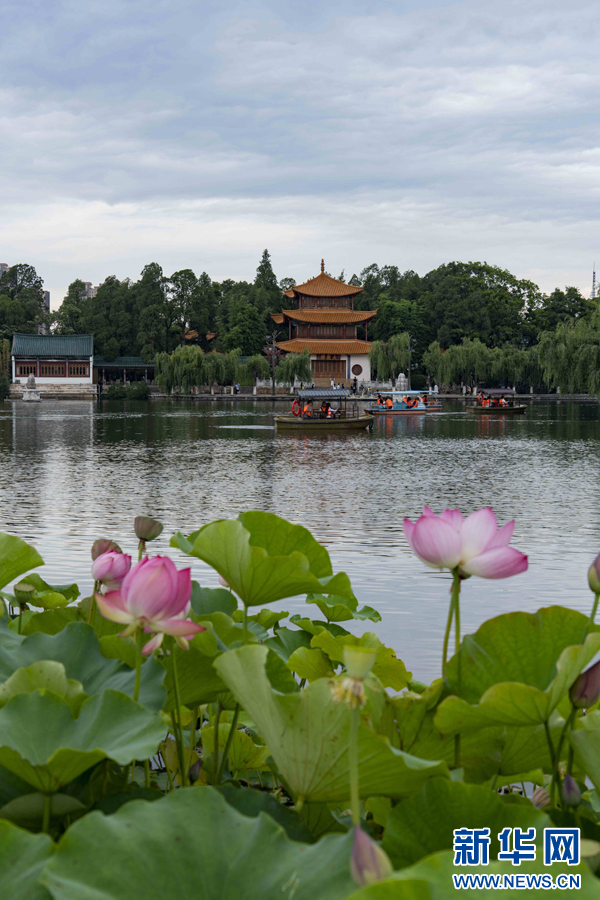 昆明市翠湖公园内绽放的荷花(6月21日摄)。(郑益 摄)