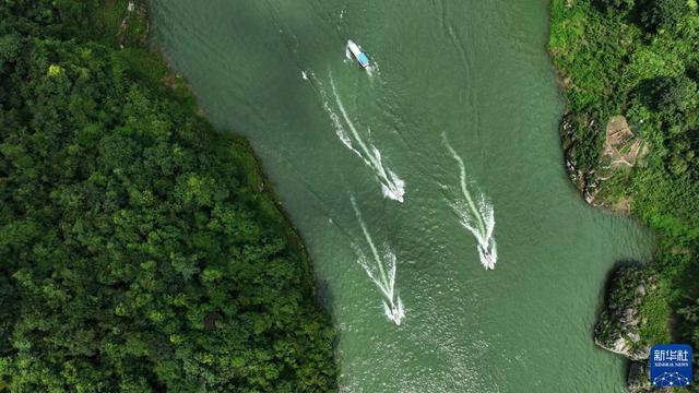 7月11日,游客在贵州省遵义市播州区楠木渡景区乘快艇游览(无人机照片)。新华社记者 杨楹 摄