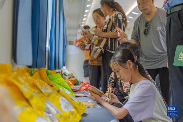 7月11日,旅客在5630次列车上的“列车集市”选购土特产。新华社记者 黄伟 摄