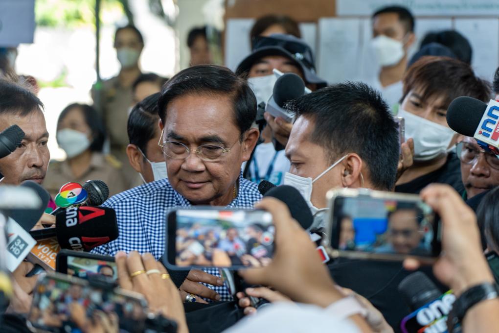 5月14日,泰国总理巴育(中)在曼谷一处投票站接受媒体采访。泰国14日举行国会下议院选举,改选下议院全部500个议席。新华社记者林昊摄