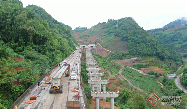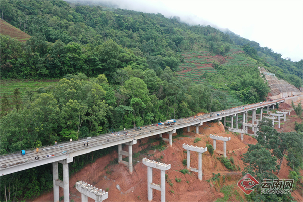 在临沧市镇康县勐堆乡大草坝3号大桥瑞丽至孟连高速公路(以下简称“瑞孟高速公路”)建设现场,施工作业人员正在进行架设梁板。各参建单位集中力量抢抓施工进度,力争早日建成通车,提升交通通达能力,惠及沿线人民群众,助推勐堆经济社会高质量发展。