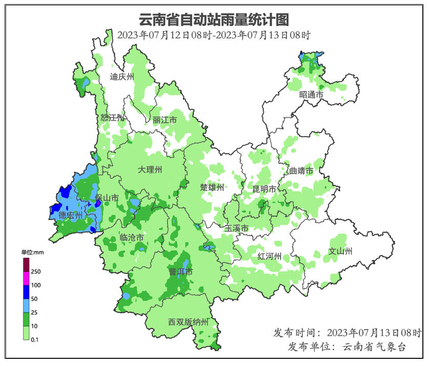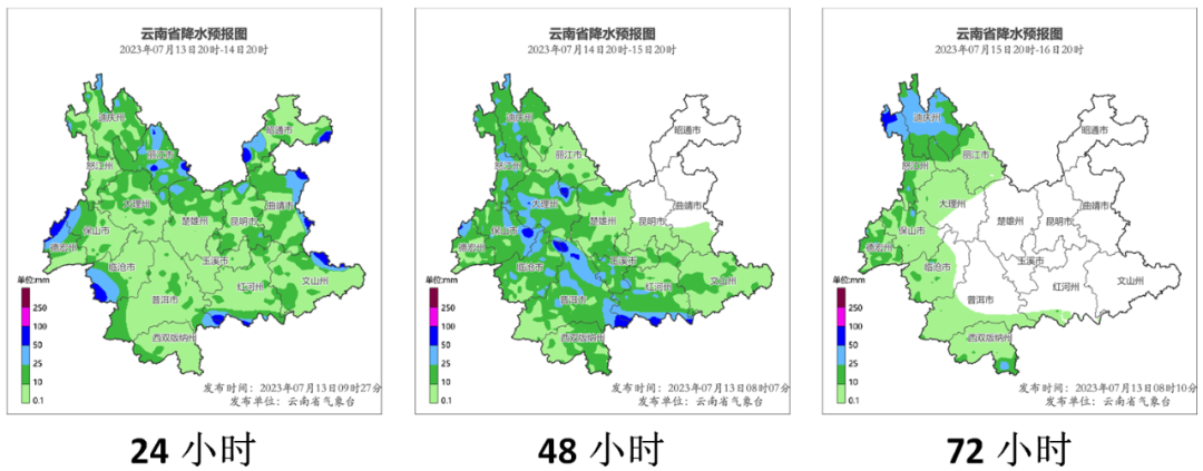 7月13日20时到7月14日20时:昭通市东部和南部、曲靖市东部、文山州东部、丽江市东部、楚雄州北部、保山市北部、德宏州、临沧市西部、红河州南部阴有中到大雨局部暴雨,其它地区多云有阵雨局部大雨。