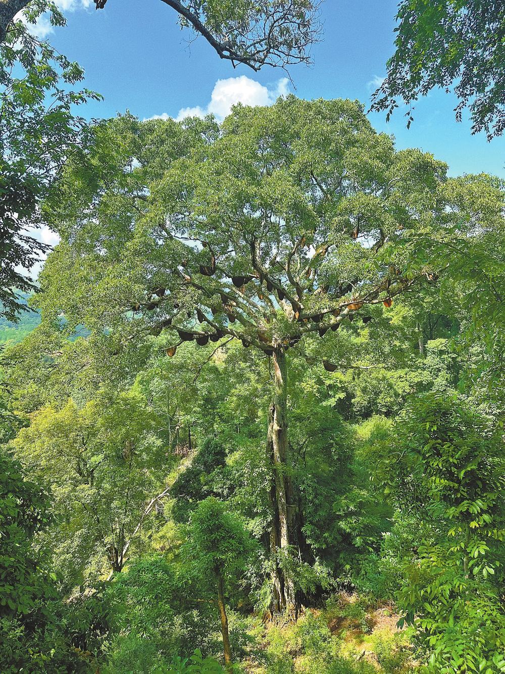 蜜蜂虽小,却是生态系统中的关键一环,还充当着环境质量“监督员”的角色。这棵蜂神树上的蜜蜂叫大蜜蜂,对生存环境要求十分苛刻,只有在没有污染的热带雨林才能看到它的身影,喜欢在植被丰富高大树木上筑巢,往往都是数群同筑于一棵树上。景迈山的生态环境优越,蜂神树就是最好的见证。