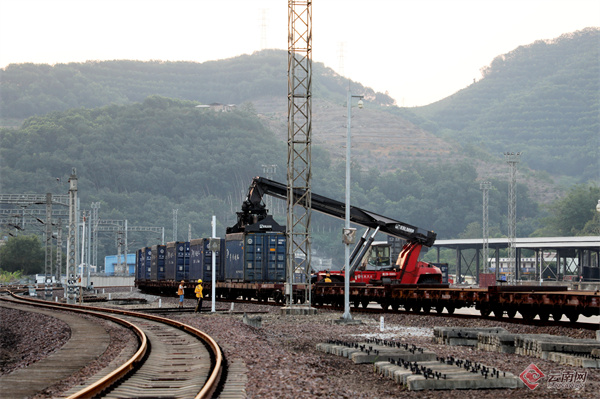 准轨河口北站正在吊装集装箱。通讯员 刘昊亮 摄