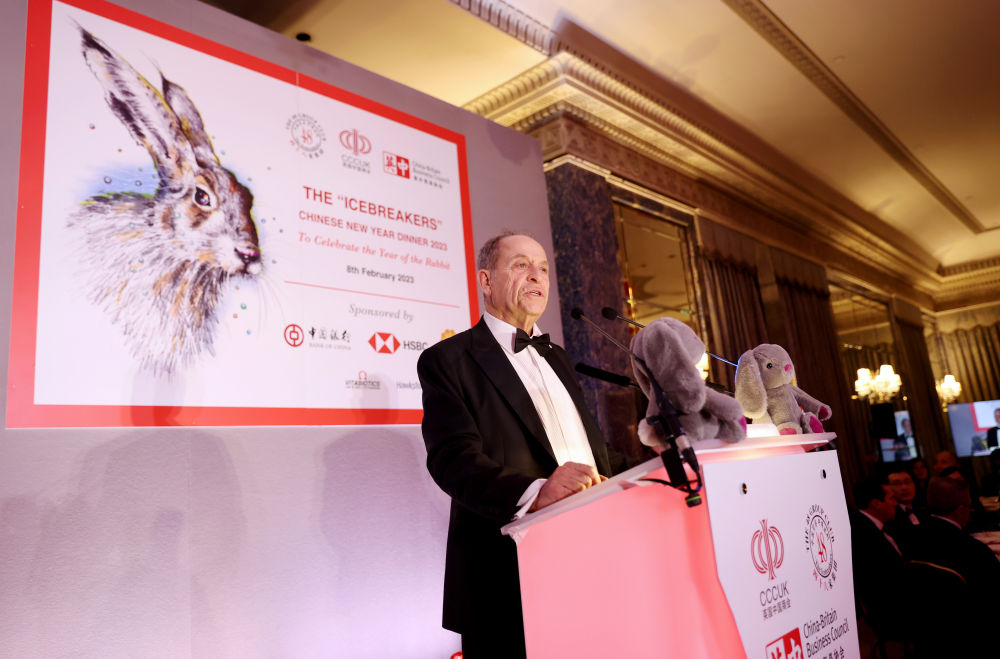 2月8日,英国48家集团俱乐部主席斯蒂芬·佩里在伦敦举行的“破冰者”2023新春庆祝活动上致辞。