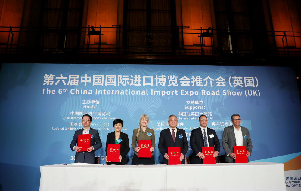 5月25日,在英国伦敦,英中贸易协会、汇丰银行等组织和企业代表与中国国际进口博览局签署合作意向书或参展合同后合影。