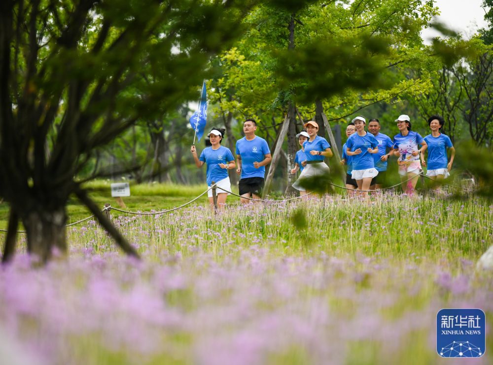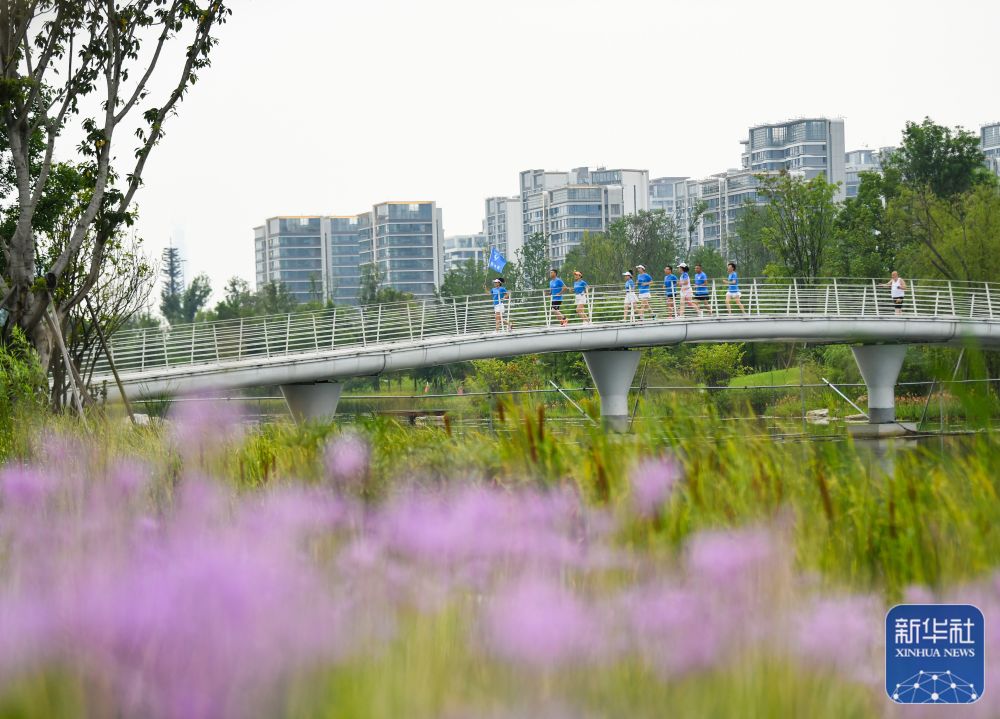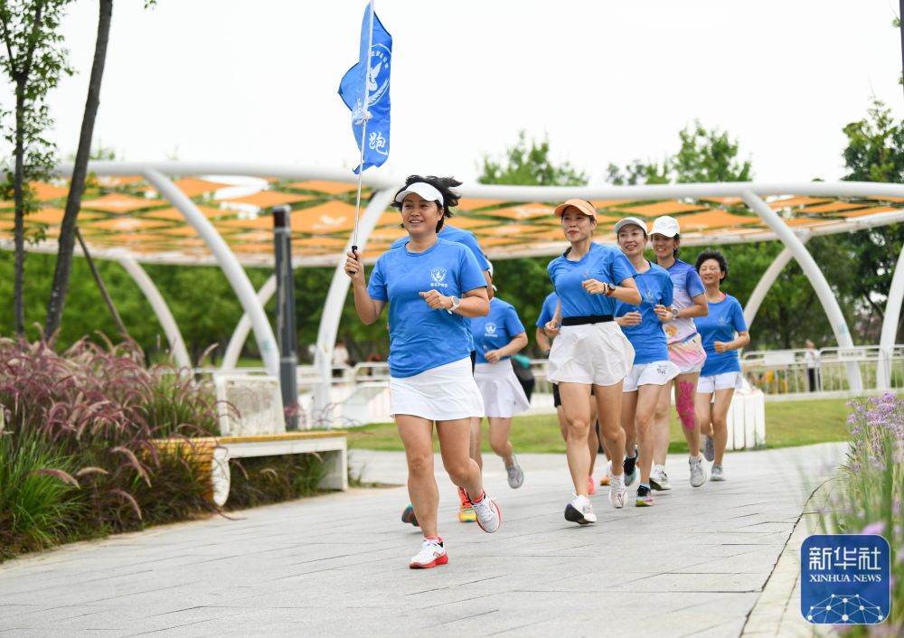 ↑在成都市龙泉驿区东安湖体育公园,杜以萍(左一)带领跑团成员跑步(7月12日摄)。