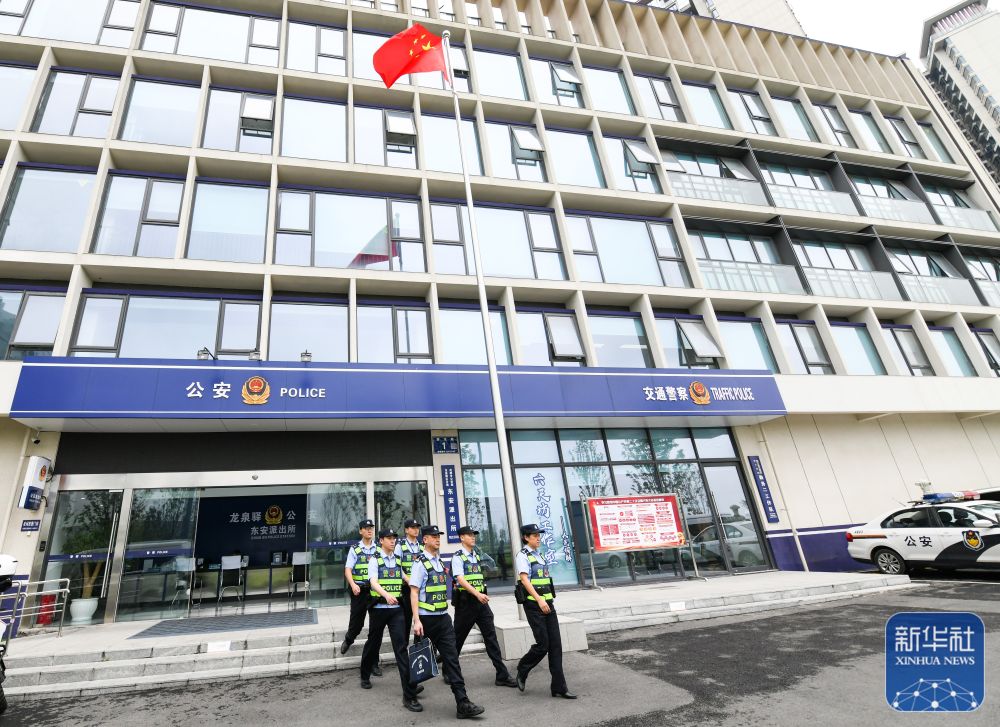 ↑在成都市龙泉驿区东安派出所,杜以萍(右一)带领所里的民警出发巡访(7月12日摄)。