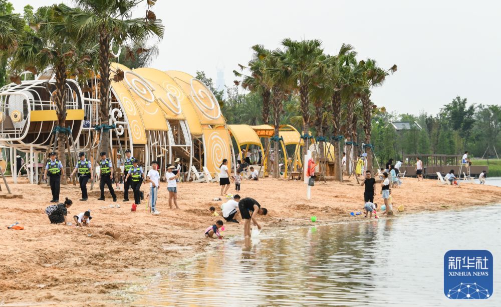 ↑在成都市龙泉驿区东安湖体育公园银沙滩,杜以萍(左二)提醒带着孩子游玩的家长注意安全(7月12日摄)。