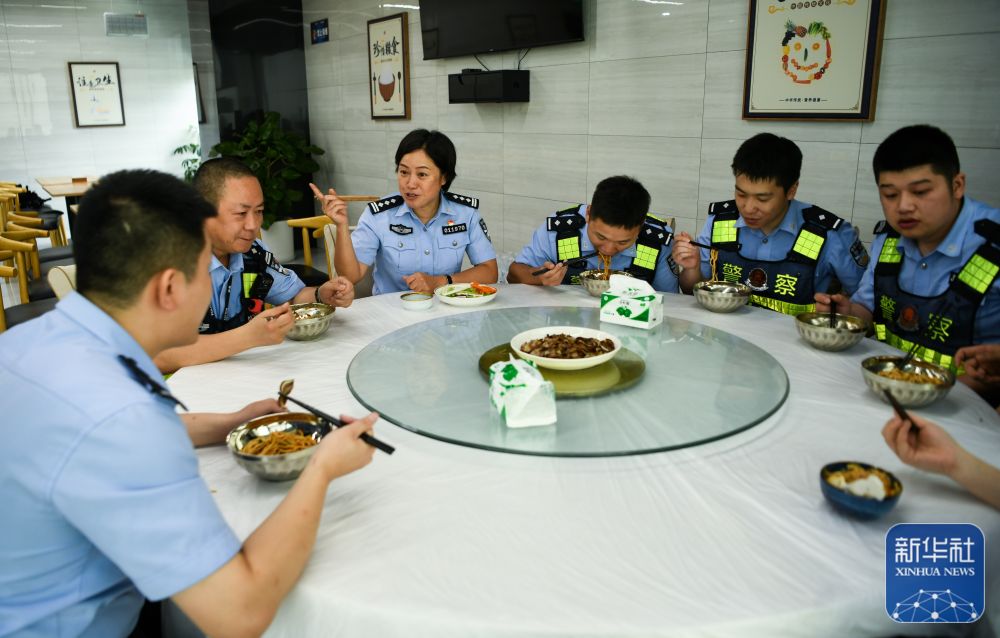 ↑在成都市龙泉驿区东安派出所,杜以萍(左三)和同事吃午饭(7月12日摄)。