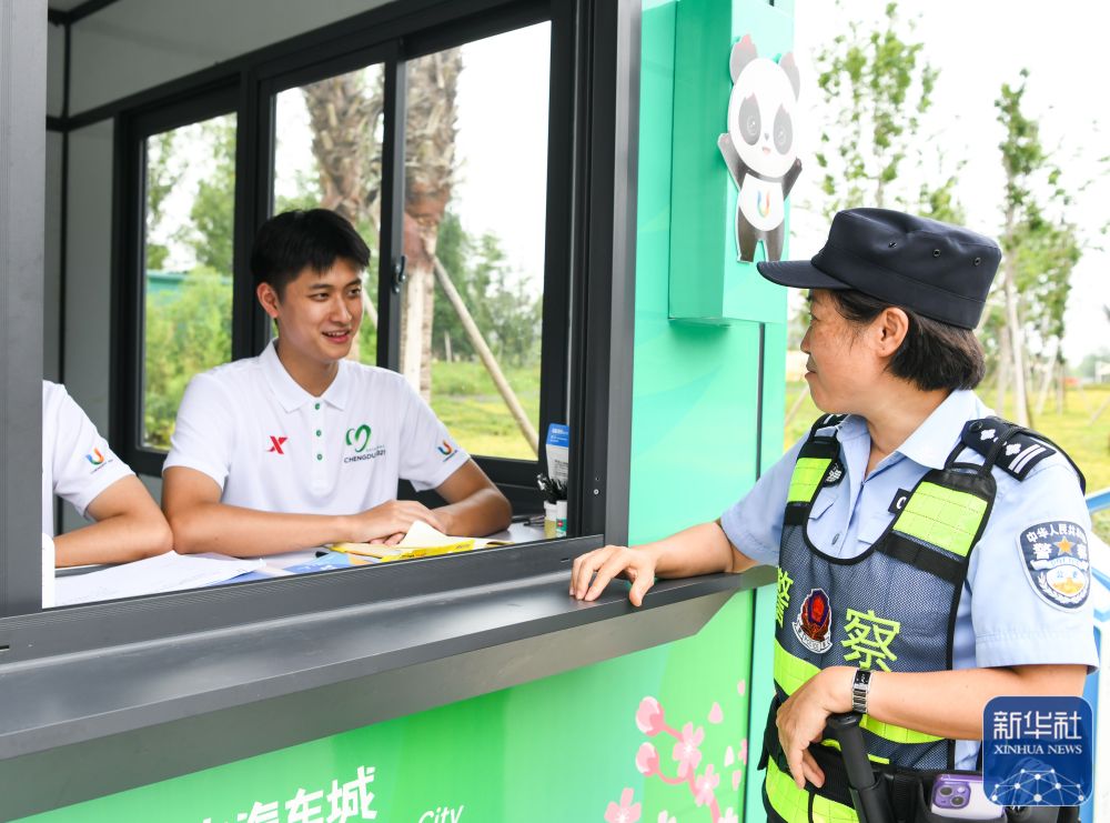 ↑在成都市龙泉驿区东安湖体育公园,杜以萍(右)外出巡查时路过成都大运会城市志愿服务小站,与正在担任志愿者的儿子周柯名交流(7月12日摄)。