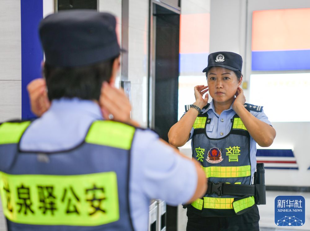 ↑在成都市龙泉驿区东安派出所,杜以萍在出发巡访前整理着装(7月12日摄)。
