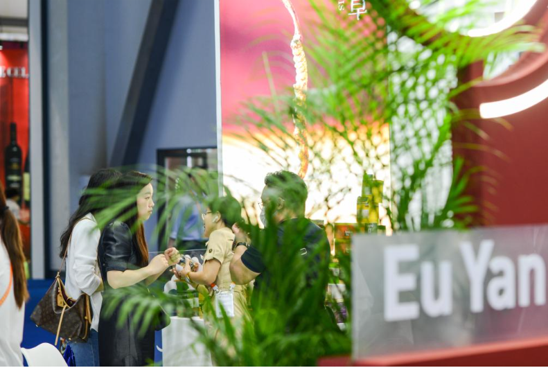 RCEP成员国企业亮相第三届消博会。2023年4月12日,参观者在新加坡企业余仁生的展台了解产品。新华社记者王泽聪摄