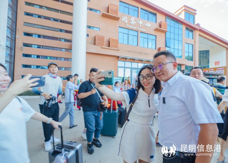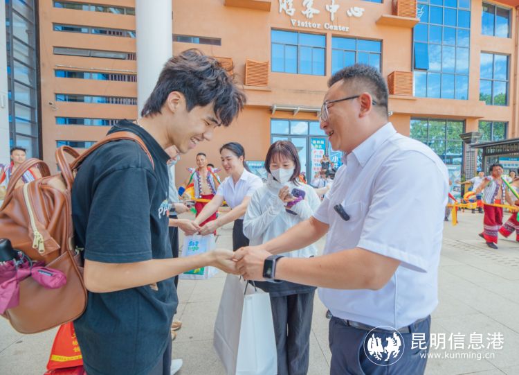 在弥勒高铁站出站口,潘金军热情地与出站游客握手交流,赠送小礼品,并为游客们介绍弥勒的各个景点,以及暑假期间推出的一系列特色文旅活动和优惠政策。