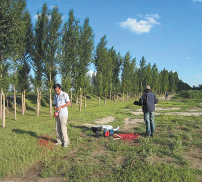 中科院沈阳应用生态研究所防护林研究团队宋立宁研究员(左)和卢德亮博士(右)在科尔沁沙地农田防护林带利用大地阻抗仪测定地下水位。孙一荣摄