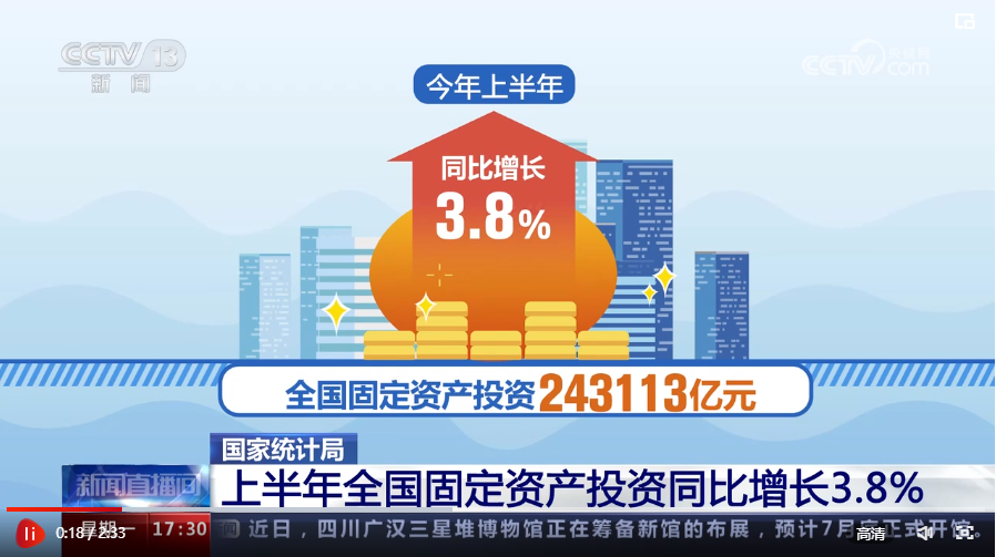 今年上半年,全国固定资产投资243113亿元,同比增长3.8%。