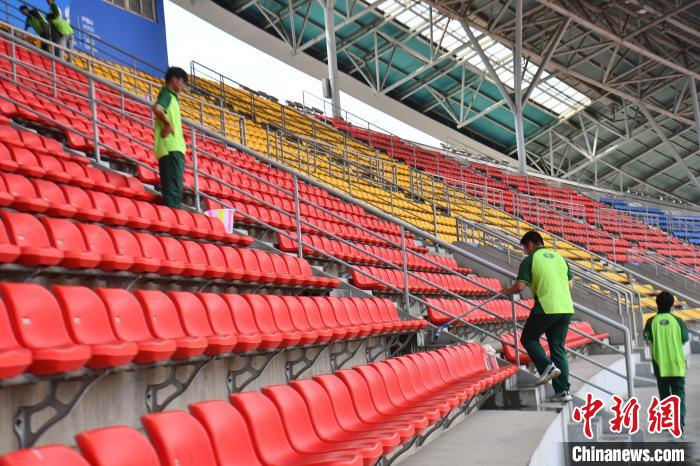 工作人员正在对观众席做清洁工作。 张浪 摄