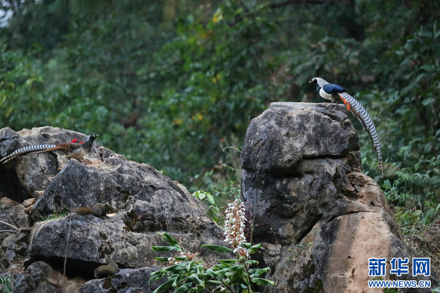 白腹锦鸡和松鼠同框(7月7日摄)。新华网发( 尹磊 摄)