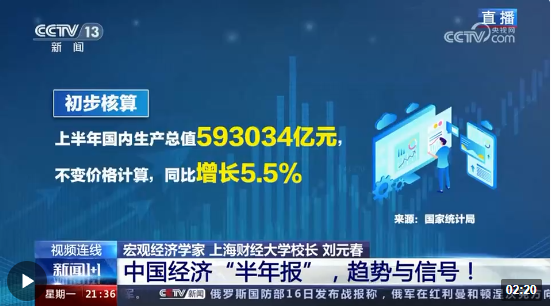 7月17日,2023年中国经济半年报出炉。今年上半年国内生产总值593034亿元,按不变价格计算,同比增长5.5%。怎么看待这个核心数据?除此之外,这份经济“半年报”里,我们还能观察到怎样的变化和特点,趋势与信号?更为重要的是,稳经济、促发展,下半年我们又还需要从哪些方面继续发力?《新闻1+1》连线宏观经济学家、上海财经大学校长刘元春,共同关注:中国经济“半年报”,趋势与信号!