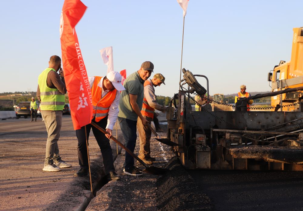 7月5日,在阿尔及利亚塔夫省,中信建设阿尔及利亚国家区副总经理亓书杰与阿高速公路管理局东部区域负责人穆罕默德·萨拉赫·卡菲共同为阿尔及利亚东西高速公路铺设最后一米沥青。新华社发(中信建设供图)