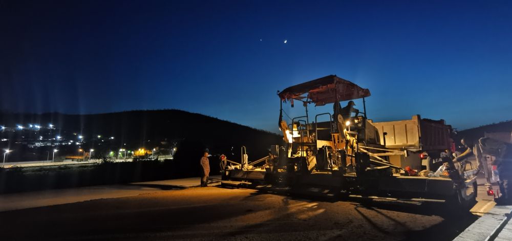6月21日,在阿尔及利亚塔夫省,施工人员连夜铺设沥青,为阿尔及利亚东西高速公路84公里项目通车做准备。新华社发(中信建设供图)