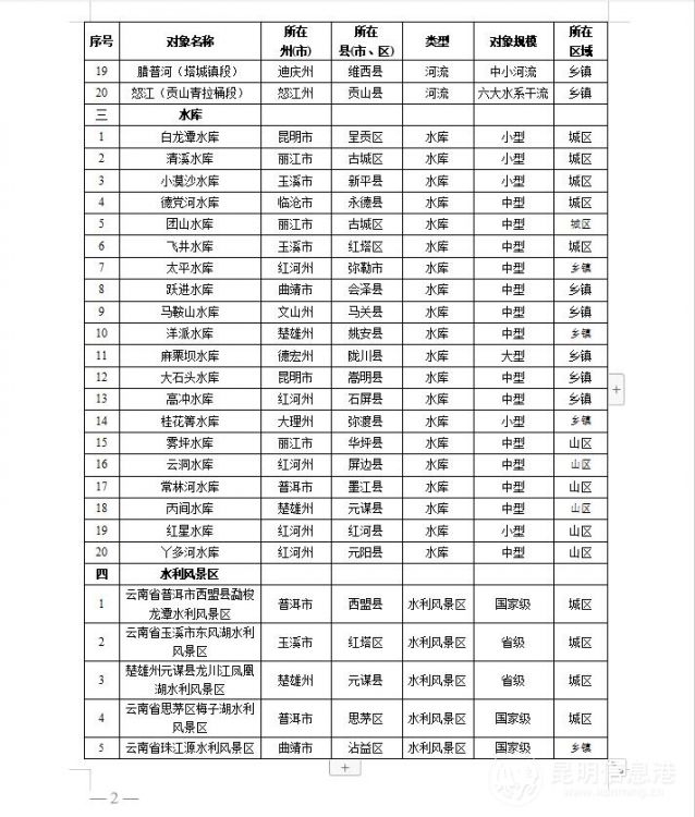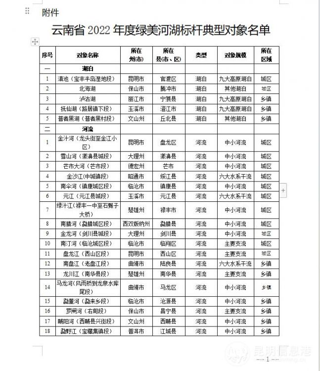 附件:云南省2022年度绿美河湖标杆典型对象名单: