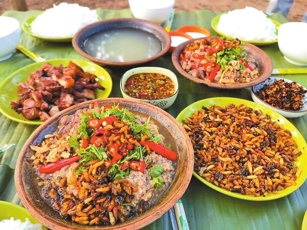 “说起来,这顿豪华阿昌族家宴倒和泰餐有几分相似。米线在泰国也是常见菜,炖汤、炒菜、火锅、沙拉都会用到米线。过手米线和泰式凉米线也很像,都是集酸、辣于一体,清凉可口。桌上还有炸蜂蛹——熟悉的味道。我一颗接一颗吃个不停,香、酥、脆,这是我童年最喜欢的小吃之一。”陈雪婷说。