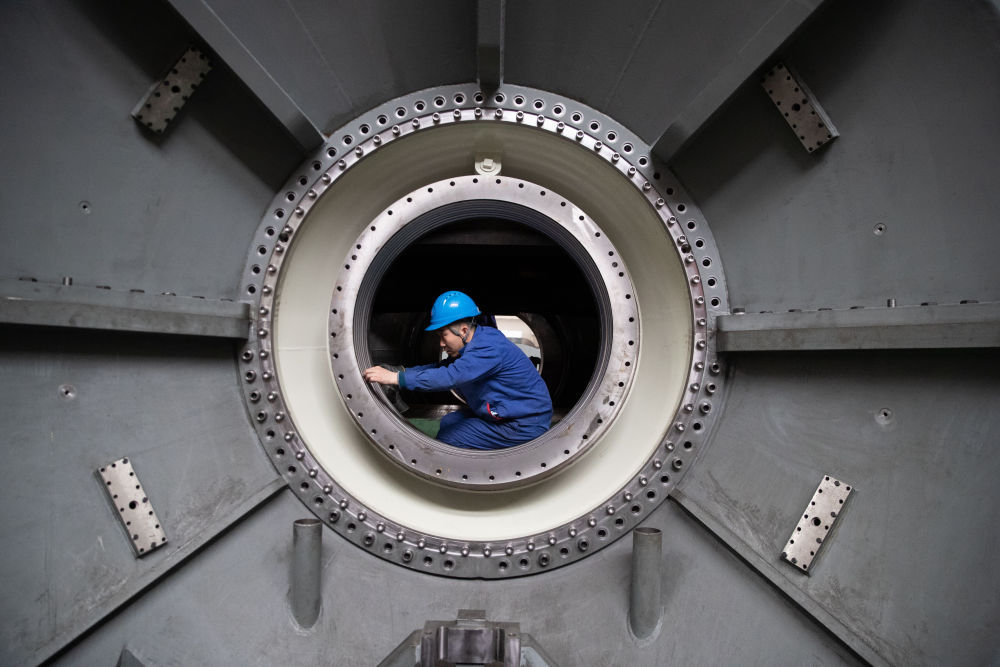 工人在哈电集团哈尔滨汽轮机厂有限责任公司车间内生产作业(4月28日摄)。新华社记者 张涛 摄