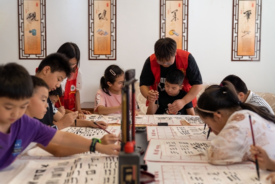 7月10日,在安徽省合肥市肥东县店埠镇新城社区暑托班上,志愿者在给孩子们上书法课。阮雪枫/摄(新华社发)