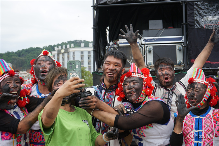 游客们在“花脸节”拍照记录