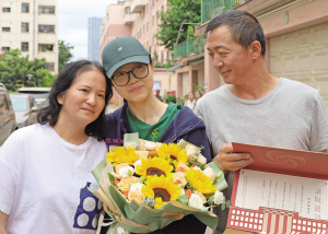 何林珊和父母一起展示录取通知书 都市时报全媒体实习生 刘志铖