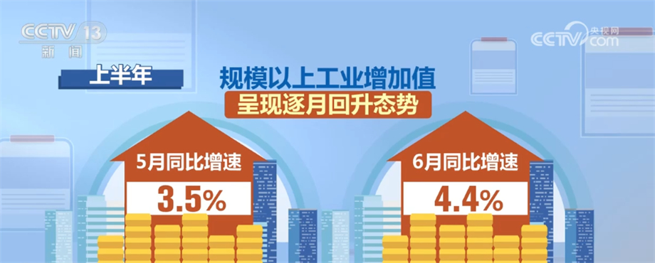 数据二:增长3.8%。工业和信息化部7月19日介绍,随着3月份以来一批稳经济政策效果持续显现,今年上半年,我国规模以上工业增加值同比增长3.8%,工业经济恢复向好。其中,5月、6月当月同比增速分别为3.5%、4.4%,呈现逐月回升态势。工业投资保持扩张,上半年同比增长8.9%,增速较一季度加快0.3个百分点。