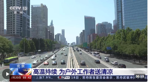 高温天气下,环卫工人、快递、外卖小哥等城市运行保障人员还在坚守岗位。在朝阳区建外街道,街道社会工作服务中心联合工会等,发动辖区企事业单位和居民,在户外工作人员忙碌的时段和点位,搭建了免费领取清凉饮品和餐包的关爱角。