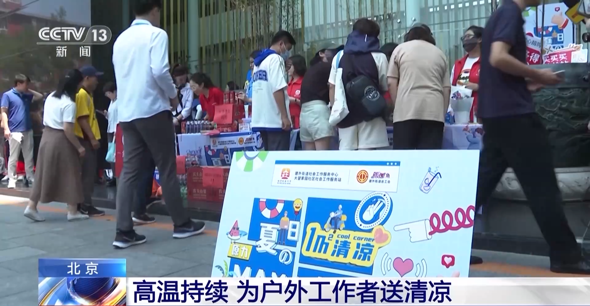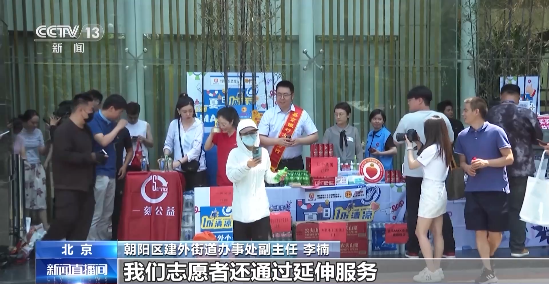 朝阳区建外街道办事处副主任 李楠:设到楼宇的门口,扩大我们服务的覆盖面。我们志愿者还通过延伸服务,会把关心关爱送清凉的物品送到快递站点,同时对于环卫工人、保安、保洁我们还会送到楼宇的物业处。