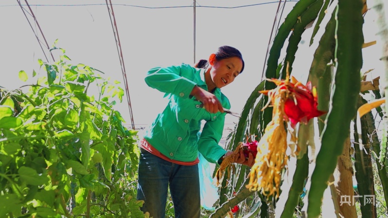 种植户王爱霞正拿着剪刀,将成熟的火龙果采摘装箱 (央广网发 若羌县融媒体中心供图)