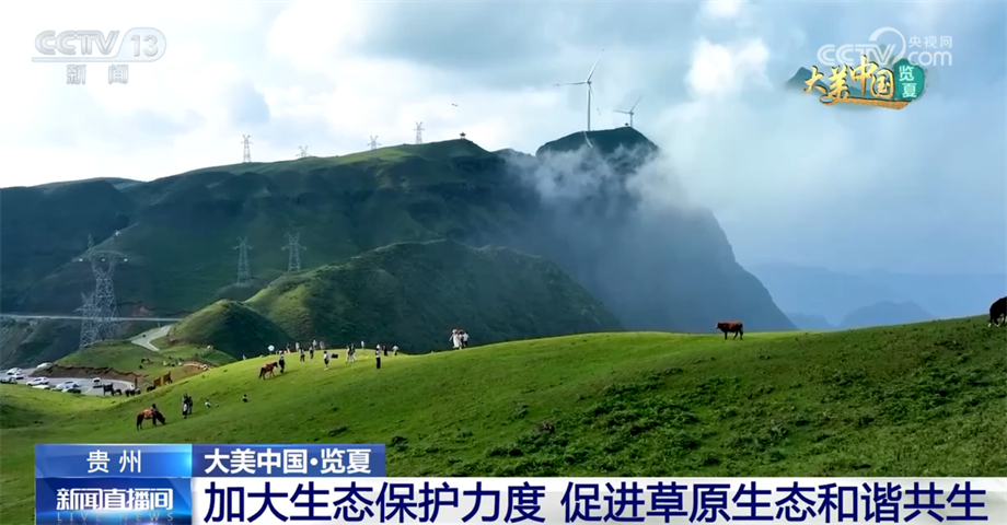 跟随镜头,我们来到贵州六盘水盘州市的乌蒙大草原。眼下,正值盛夏的乌蒙大草原水草丰茂、碧绿如茵、牛羊成群,从空中俯瞰,缥缈的云雾将草原装扮得十分梦幻。乌蒙大草原最高海拔2857米。因为地处高海拔地区,这里的气候适宜,吸引了许多游客来到这里避暑旅游。近年来,当地加大对村民和游客的宣传引导力度,并采取措施限制过度放牧,严厉打击采挖野生高原矮杜鹃和驾车碾压草地等行为,保护草原生态平衡,维护生物多样性,让乌蒙大草原生态持续向好,实现人与自然和谐共生。