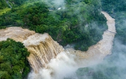 游客在新疆阿勒泰地区喀纳斯景区体验漂流项目(7月19日摄,无人机照片)。新华社记者丁磊/摄