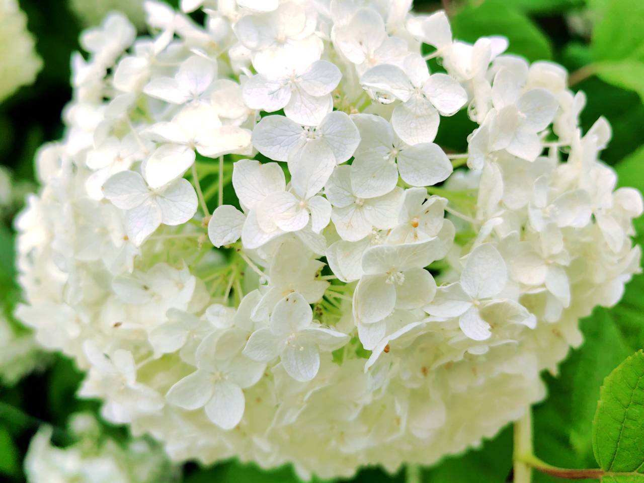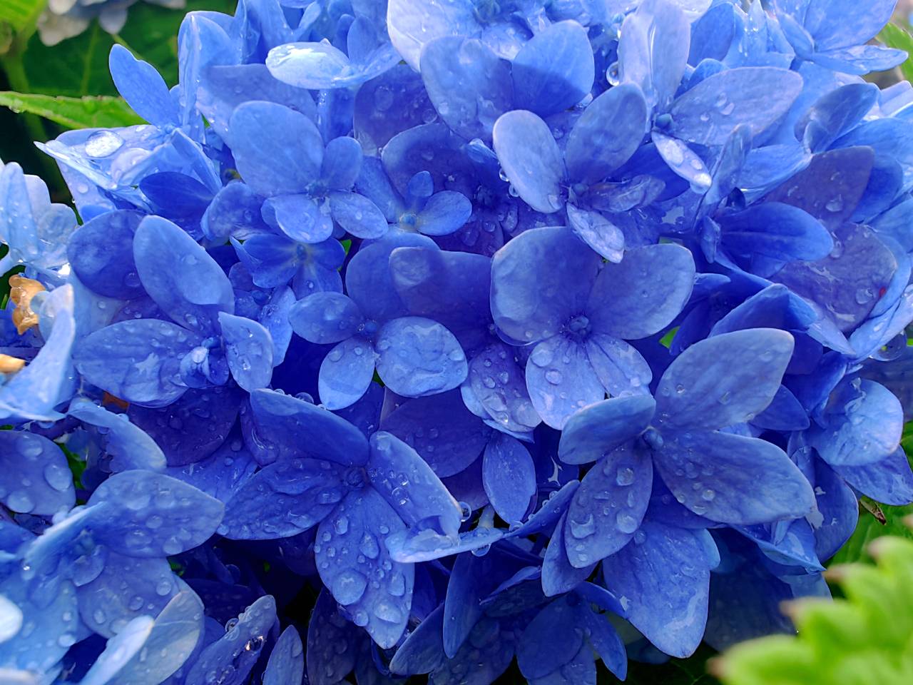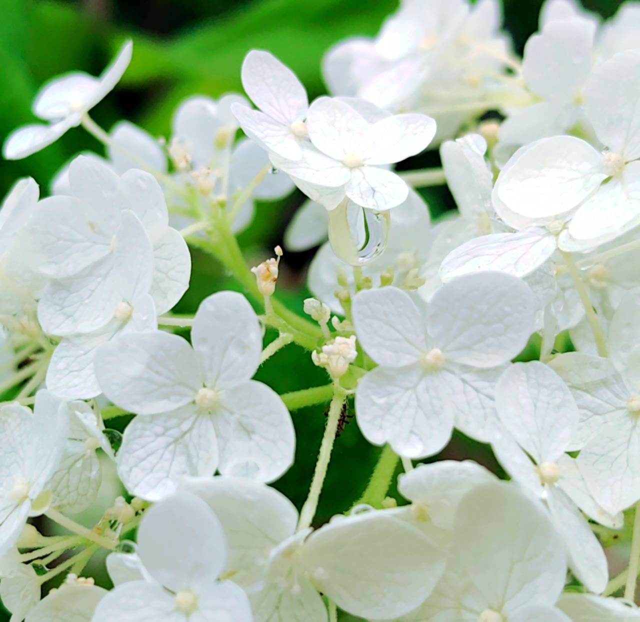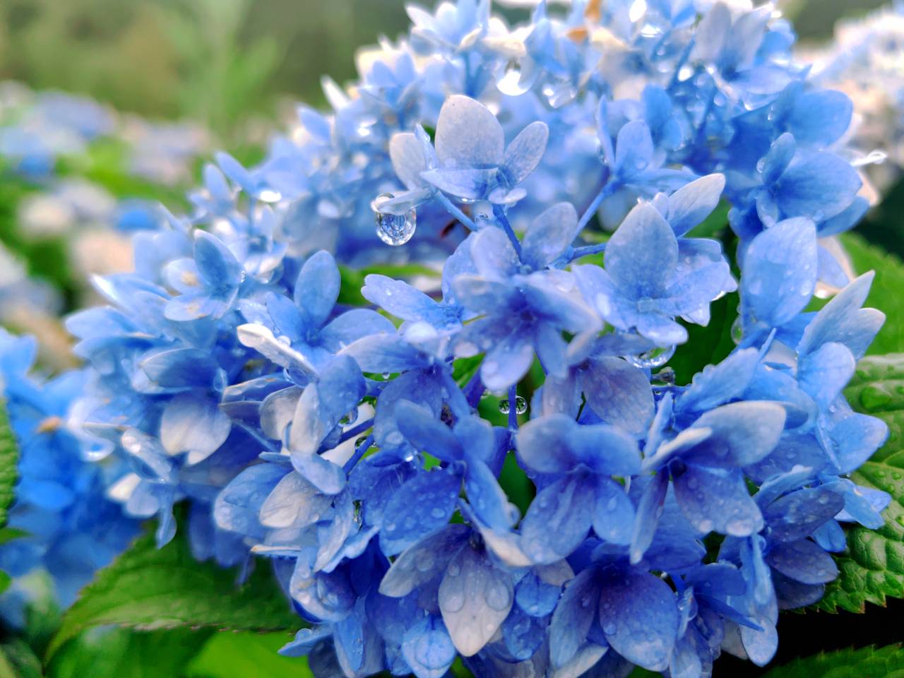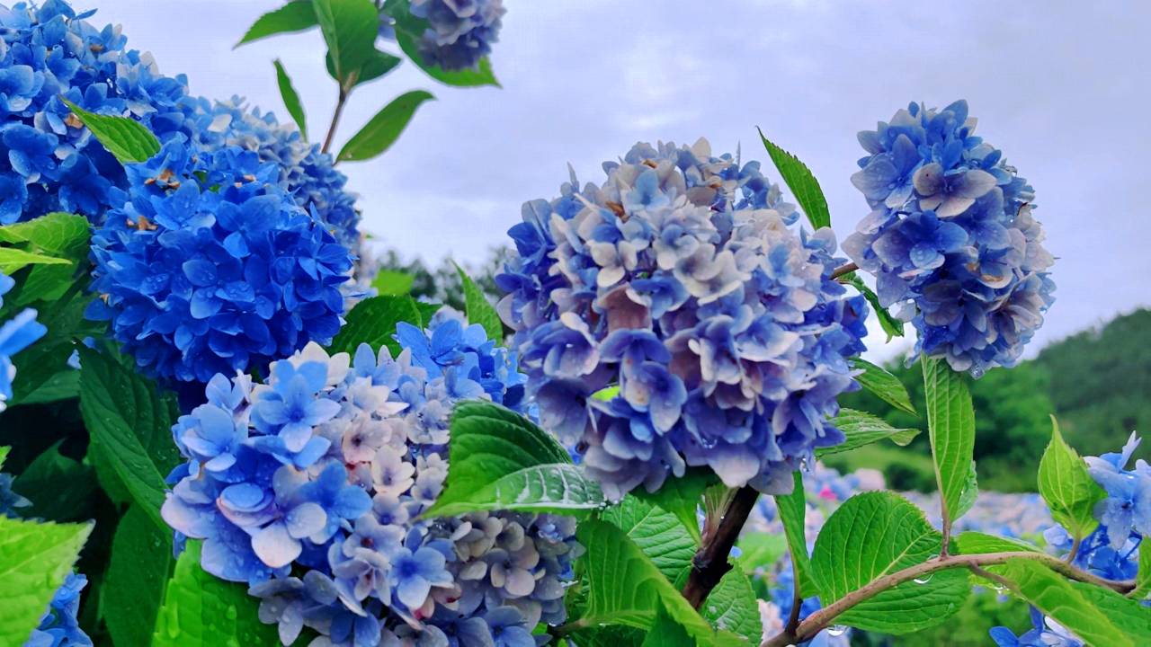 雨中的绣球枝繁叶茂,宛若新生,椭圆形的宽大叶子青翠舒展,每片叶子每个花球都托着新鲜的雨珠,色泽明艳动人,晶莹的雨珠沿着叶面流动、聚集、滴落,姿态楚楚可人。被绣球花点缀的青山绿水宛如童话世界!