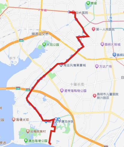 K22路起终站为半岛车场(起始站)—前兴路公交枢纽站(终到站),新增停靠滇池会展中心(环湖东路)、环湖东路口(会展西路)、会展西路中段(去)、会展北路口(会展西路)(回)这5个公交站,取消停靠滇池会展中心(会展南路)、滇池会展中心4号馆、会展西路口(会展北路)(回)这3个公交站。调整后起终站、票价不变,运营时间调整为7:00—18:00,具体发车时间7:00、16:30、18:00。