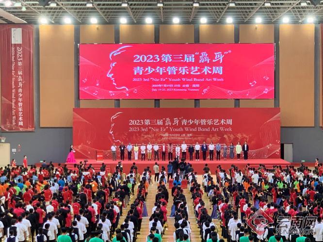 7月20日上午,第七届聂耳音乐周昆明分会场系列活动——第三届聂耳青少年管乐艺术周在五华区体育运动中心正式开幕。上千名管乐青少年共同奏响国歌《义勇军进行曲》,传承聂耳先生爱国主义教育精神,弘扬民族文化精髓。