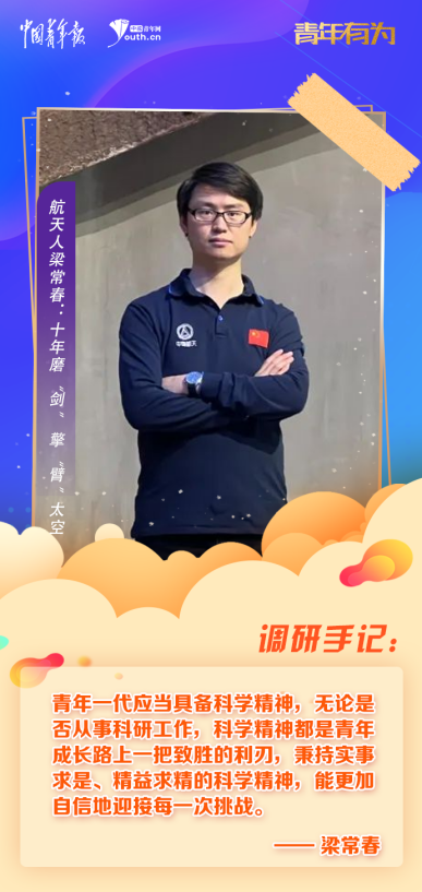 梁常春也是一大批航天青年“挑大梁、担重任”的缩影,他们展现着新时代中国青年奋发有为的精神风貌。