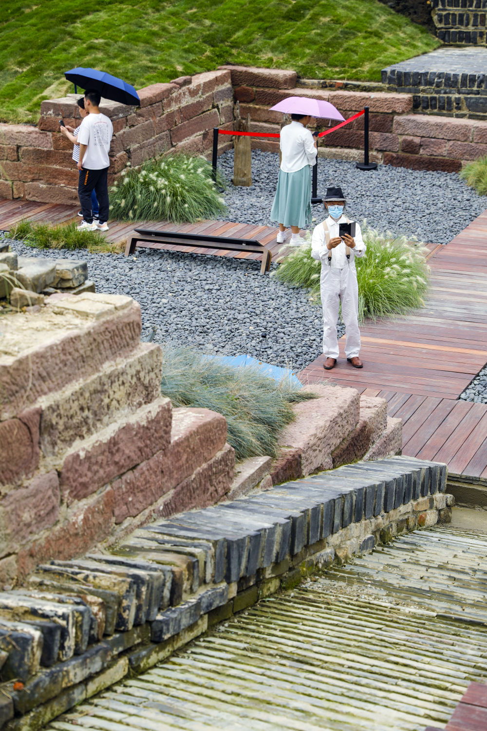 7月20日,在成都东华门遗址公园外场遗址区,人们在参观原状展示的水道踏道遗迹。新华社记者 沈伯韩 摄