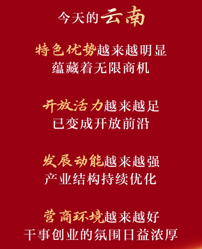 今天的云南,特色优势越来越明显。不仅自然风光秀丽,历史文化悠久,还具有得天独厚的区位、绿色能源、高原特色农业、文旅、矿产、生物资源、劳动力等优势,发展潜力巨大,蕴藏着无限商机。就拿旅游来说,疫情之前,每年有8亿多人次到云南旅游。今年上半年,全省游客达5.39亿人次、旅游总收入6934亿元,已远超2019年水平。我们推出的“有一种叫云南的生活”,短短4个月,全网阅读量超过90亿次,云南魅力“网红”全国。